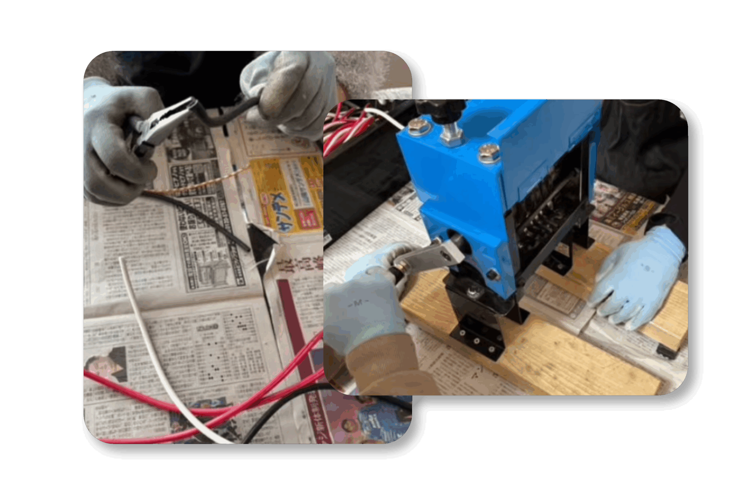 専用の機械に電線を通してハンドルを回し、電線のカバーに切れ目を入れ、カバーと銅線部分に分けていきます。