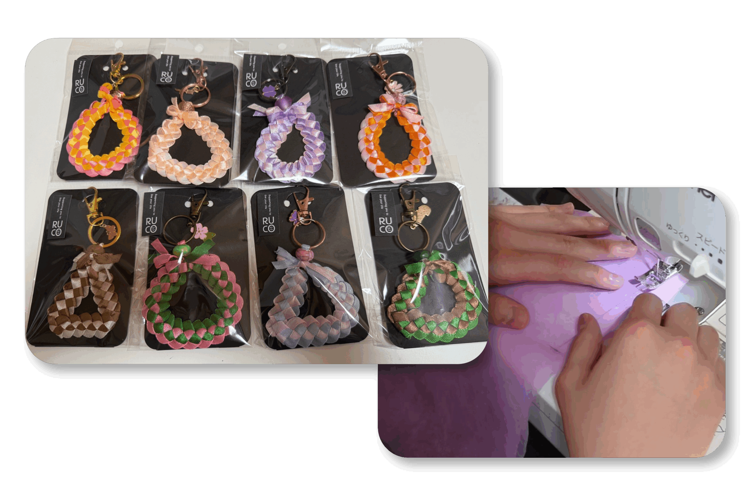 手芸をやったことがない人も、ミシンや、ひもを編んで作るストラップなどの作り方を丁寧に教えてもらいながら作業をしています。